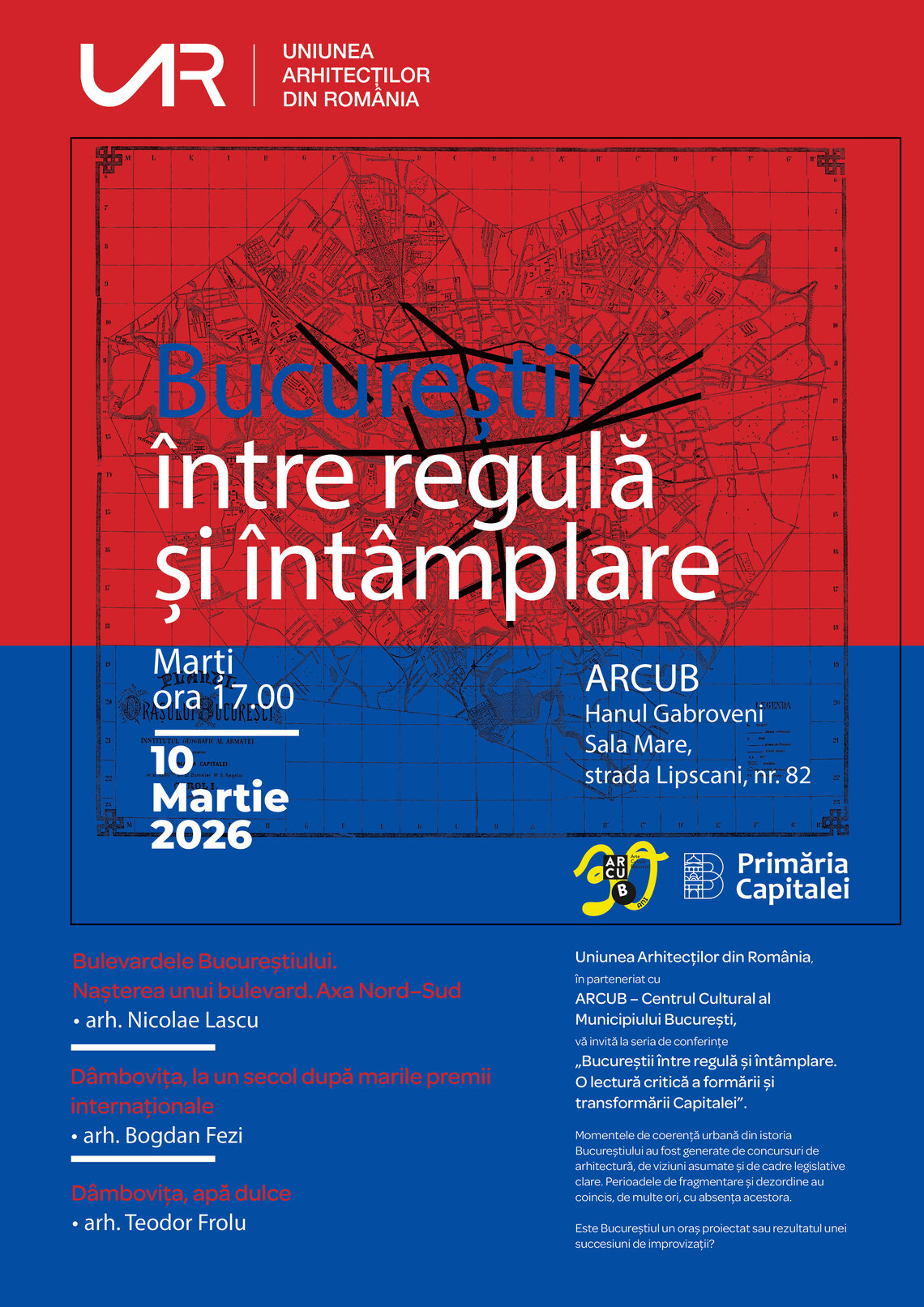 Uniunea Arhitecților din România, în parteneriat cu ARCUB – Centrul Cultural al Municipiului București, vă invită la seria de conferințe „Bucureștii între regulă și întâmplare”, marți, 10 martie, ARCUB - Hanul Gabroveni, ora 17.00