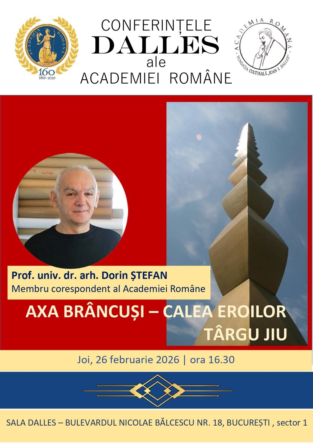 Conferința susținută de Prof. univ dr. arh. Dorin Ștefan, Axa Brâncuși – Calea Eroilor Târgu Jiu! joi, 26 februarie 2026 - ora 16.30, Sala Dalles, Bulevardul Nicolae Bălcescu nr. 18